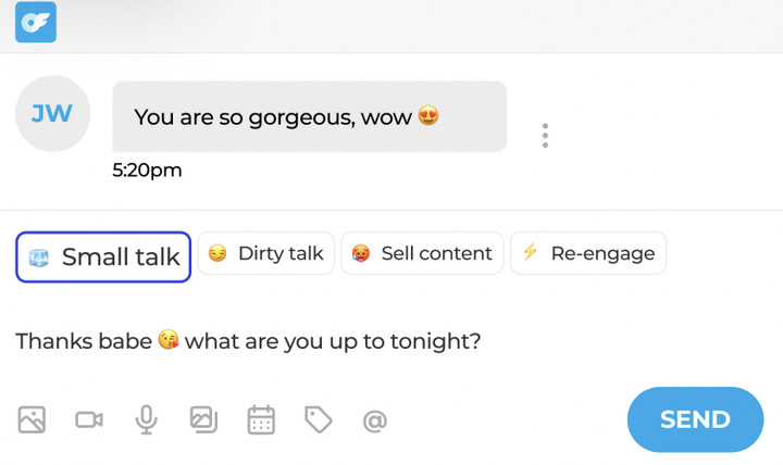 不過,OnlyFans 禁止 AI 回覆聊天。上有政策,下有對策,AI 寫消息,人類點發送鍵,總體還是比以前更加高效,一個人就能負責幾百個聊天對象。但很難説,是輕鬆了,還是更痛苦了。