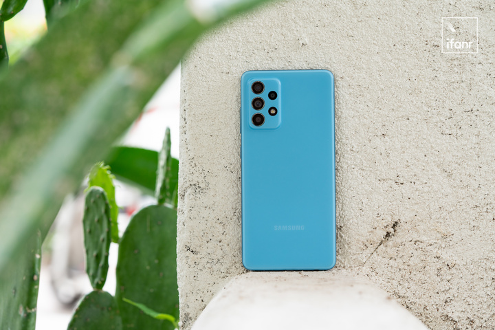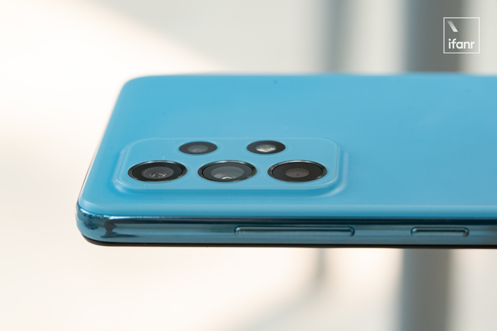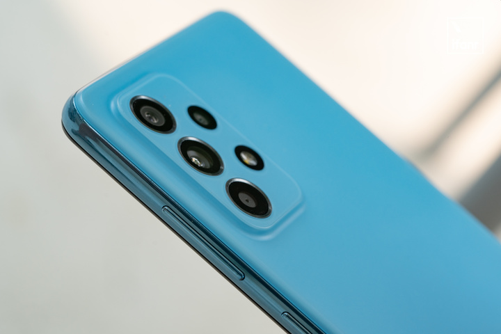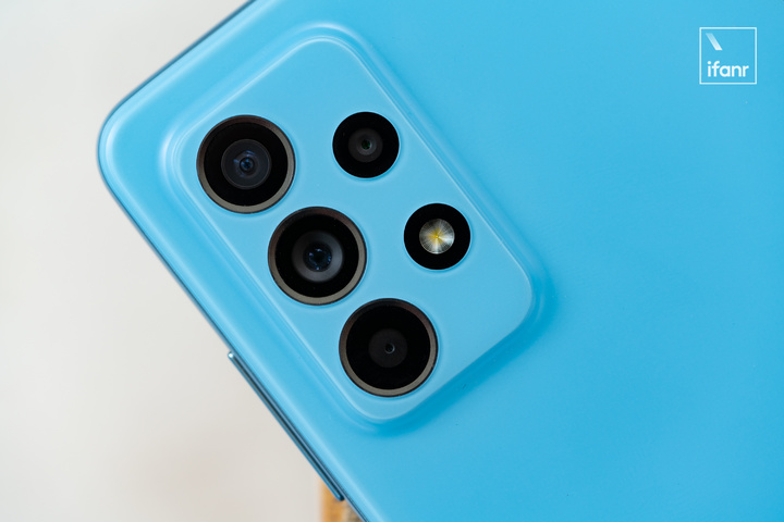 三星 A52 5G 的後置四攝由 6400 萬像素(IMX682)主攝、1200 萬像素超廣角、500 萬像素景深鏡頭(f/2.4)、500 萬像素微距鏡頭組成。攝像頭模塊的凸起幅度不大,得益於一體成型的塑料背板,攝像頭模塊的邊緣過渡非常平滑,與背面渾然一體。
