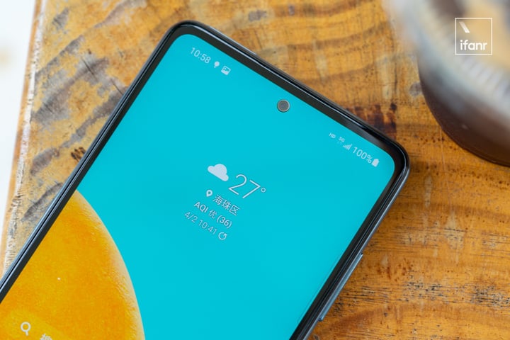 前置攝像頭位於屏幕頂部居中,這樣的挖孔屏幕在三星的營銷術語中,還有另一個代號名稱:Infinity-O 顯示屏。可以留意到,A52 5G 的前置攝像頭孔徑較小,而且攝像頭和屏幕周圍的交接處有一圈亮邊包圍,在息屏的時候依然能夠輕易看到前置攝像頭的位置。