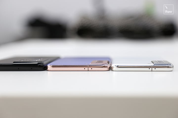 不過實際從機身厚度來説,S21 5G 系列和上一代基本保持了一致的水平。最小的 S21 5G 機身厚度 7.9mm,S21+ 5G 厚度 7.8mm,都和上一代的 S20 系列保持了一致,只有 S21 Ultra 5G 從 8.8mm 略微增加了一點點到 8.9mm。所以從握持感上來説,這方面是察覺不出變化的。