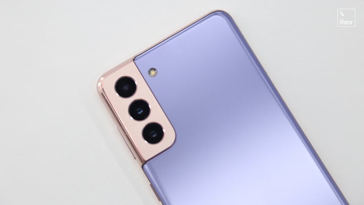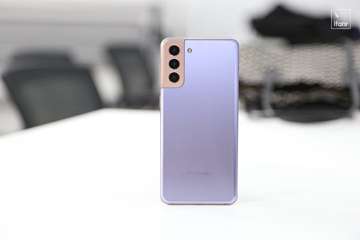 紫色是 S21 5G 系列中比較特別的顏色版本,而且採用了撞色設計,攝像頭部分延續了中框的銅金色,而背板則是紫色。同時形成了材質拼貼和撞色,所以整體的觀感會更特別一些。