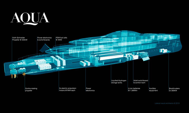 科技含量最高的當屬隱藏在甲板下方的兩個 28 噸的真空密封罐,其內部温度只有零下 253 度,保存的液態氫是這艘遊艇的動力來源,它與氧氣結合為兩個一兆瓦的引擎和推進器產生動力,也就是我們熟悉的燃料電池,而反應的產物只有水,清潔無污染。