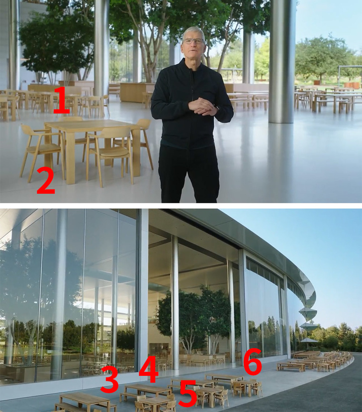 價值超過 40 億美元的蘋果公司總部大樓 Apple Park,是每場線上發佈會的重點場景。跟着飛速跳轉的攝影畫面,蘋果員工朝夕相處的辦公配置也被一一揭曉。