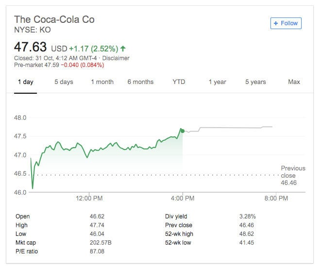財報發佈後,可口可樂週二股價大漲 2.52%,報收於每股 47.63 美元,創今年以來新高。
