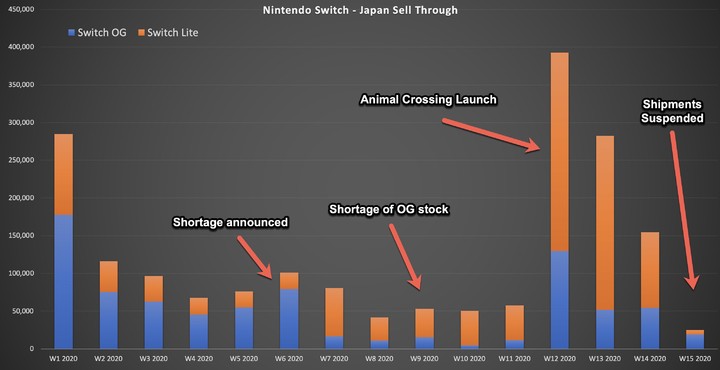 引用「日本的情況為例,2 月底任天堂發出預警,原版 Switch 銷量開始大幅下降,但當時還有 Switch Lite 支撐;之後等到動森遊戲上市,再次推高了兩個版本的 Switch 銷量,但也因供給無法及時跟進,任天堂在 4 月初暫停向日本本土出貨,一週後才恢復。」