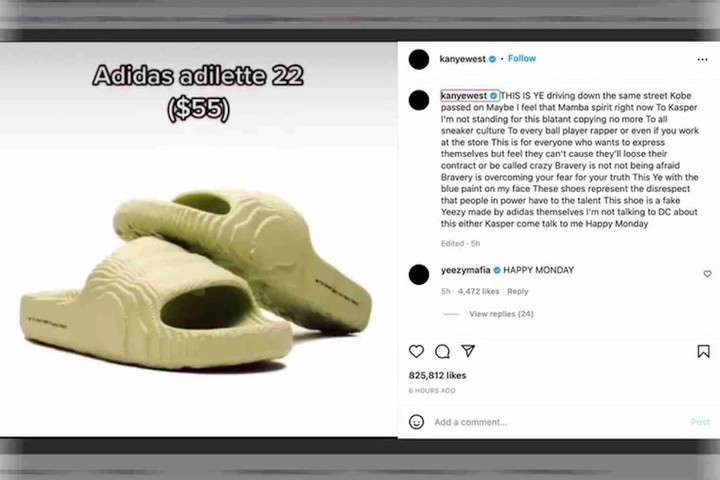 6 月 15 日,侃爺(Kanye West/Ye)在 Instagram 公開喊話 adidas CEO,指責阿迪的新拖鞋 Adilette 22 抄襲了他的 YEEZY Slide。
