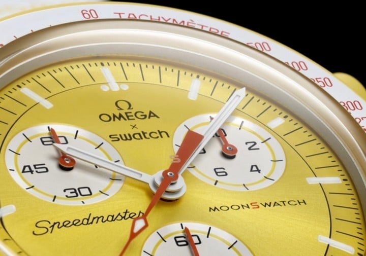 錶盤和錶冠上,四處遍佈着「OMEGA X SWATCH」的聯名標識。