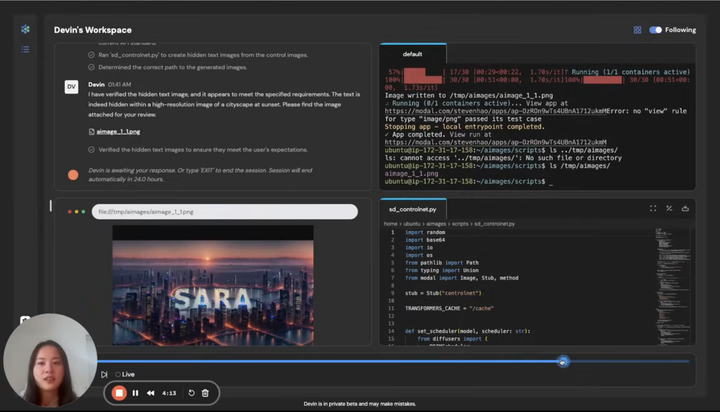 Devin AI 可以學習和使用「不熟悉」的技術。其在閲讀了一篇博客文章後,現學現賣,自主編寫代碼,在 Modal 上運行 ControlNet 並且生成了一張帶有隱藏文字「SARA」的圖片: