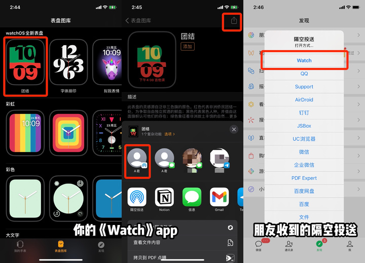 以《Watch》中打開這款錶盤描述頁為例,點擊右上角分享按鈕,就可以快速分享你自己設置好配色、功能等元素的錶盤,發送給好友使用。