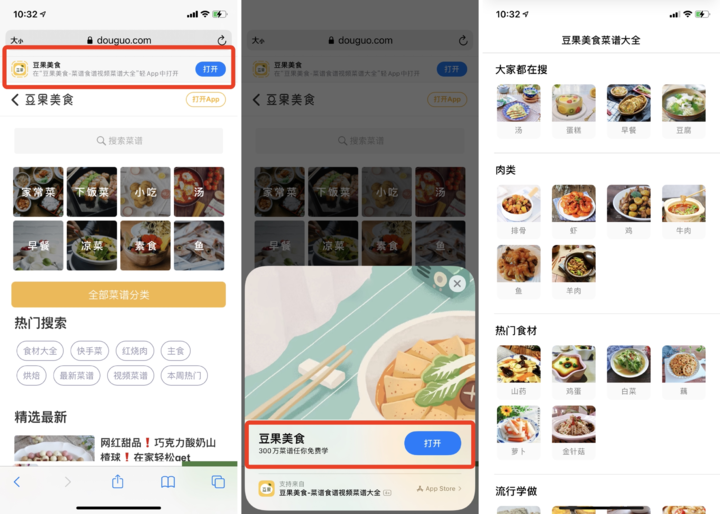 下面重點説説如何通過 Safari 搜索進入。以在百度搜索「豆果美食」為例,進入其官網,就能看到頂部打開輕 App 的引導橫幅。