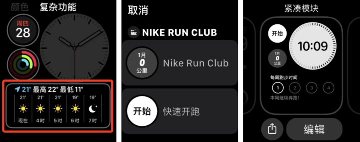 耐克的跑步記錄 app《Nike Run Club》,也推出了不少樣式,你可以長按錶盤,選擇「緊湊模塊」後進行復雜功能調整。