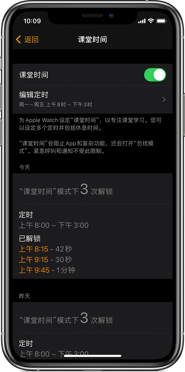比如綁定孩子的 Apple Watch,你就可以為其設置「課堂時間」,上課時將無法使用手錶豐富的功能,對於解鎖次數、解鎖時間等信息,也會在你的 iPhone 上顯示。
