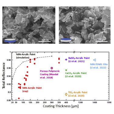 引用六方氮化硼具有很高的折射率,這會導致強烈的陽光散射;它的顆粒也具有獨特的形態,我們稱之為納米血小板,在反彈太陽輻射方面比之前的球形納米顆粒更有效。
