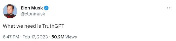 2 月 17 日,馬斯克在 Twitter 上寫道:「我們需要的是 TruthGPT。」他不滿的是,ChatGPT 拒絕回答某些有爭議的問題。
