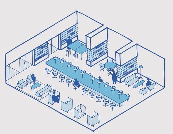 第一類是「圖書館」,採用了開放和私密混合的形式,既有未分配的協作台,也有獨立安靜的隔間,讓人專注解決工作,適合存在多種工種類型的企業,密切的協作和不被打擾的專注可以同時存在。
