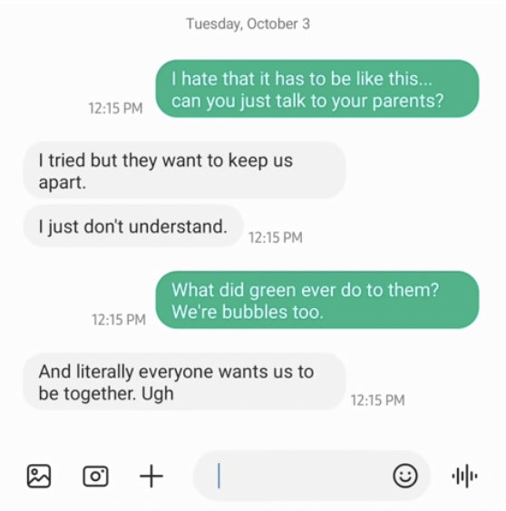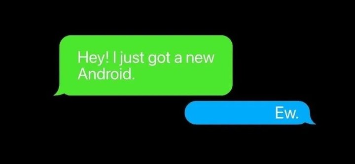 天差地別的體驗,長着兩張不同的臉。iPhone 之間的聊天氣泡是藍色的,但 iPhone 和 Android 之間的聊天氣泡是綠色的。