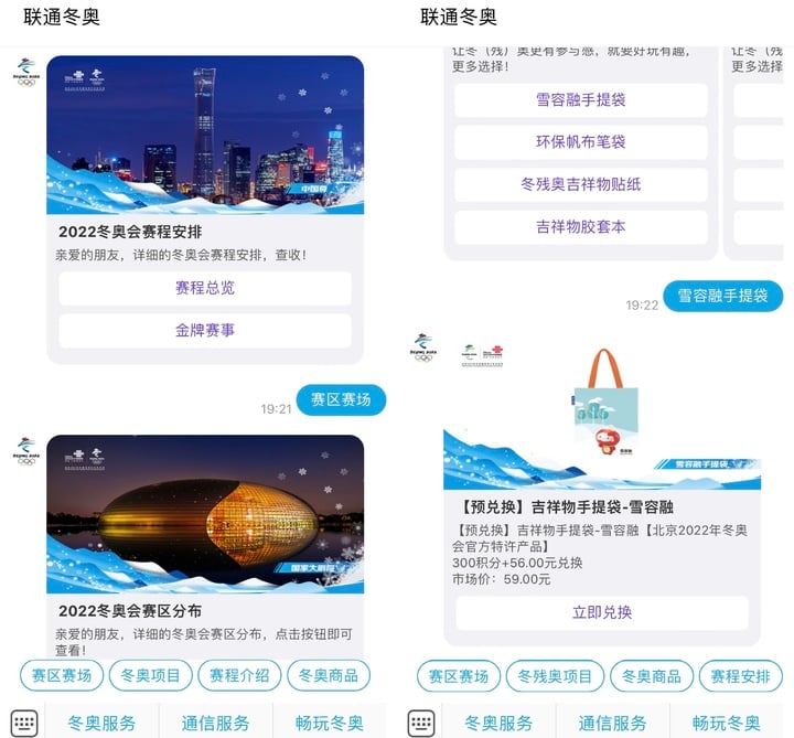 比如在 2022 年,聯通為了冬奧推出的 5G 消息,基於短信原生窗口,無需登錄和下載,支持中英雙語,提供賽事介紹,推廣聯通服務,上架周邊商品。