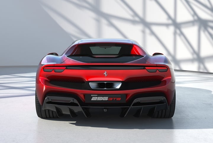 法拉利 296 GTB 的尾部設計非常有層次感。在中置雙出的排氣上方,還包括一個由尾燈與可摺疊擾流板組成的水平設計元素,一條黑色線條貫穿左右尾燈。