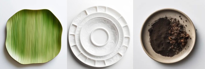 ChatGPT 生成的文本,再輸入給 Midjourney,最終得到了 AI 生成的圖像,這些盤子的形狀不變,只有材料不同。