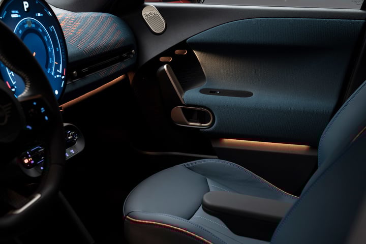 MINI Aceman 在環保方面也做出了努力,車內大量使用再生材料和織物材料,座椅表層採用織物或 Vescin 素皮材料,全車摒棄使用皮革。生產過程中採用 100% 綠電,體現了 MINI 對可持續發展的承諾。