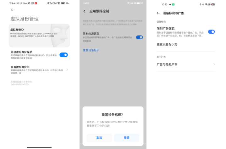 ▲ 從左至右:MIUI 12.5 的虛擬身份,Flyme 9 和 ColorOS 的限制廣告追蹤開關。