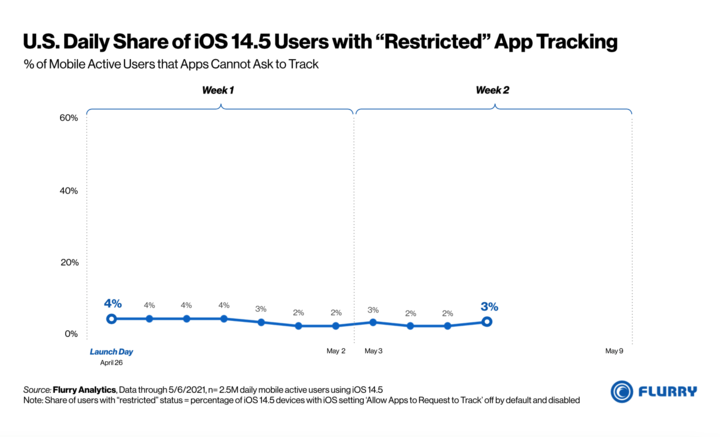 美國一家分析公司 Flurry 跟蹤了 iOS 14.5 推送之後,允許跟蹤和「要求不跟蹤」的 iPhone 用户數量,根據 250 萬的每日移動活躍用户抽樣分析,在美國大約只有 4% 的用户允許應用獲取 IDFA(廣告標識符)並允許跟蹤。