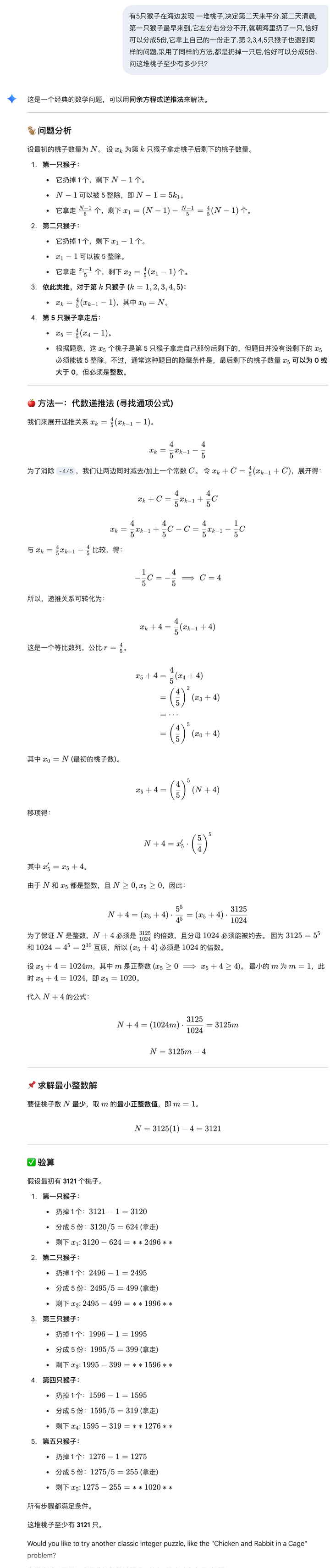 在推理能力上,我用到了那道經典的猴子分桃問題,Gemini 答案不光對,也進行了二次驗算。