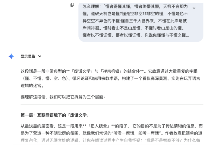 面對「懂者得懂其懂, 懵者終懵其懵, 天機不言即為懂, 道破天機豈是懂」這種故弄玄虛的文字遊戲,Gemini 的處理方式很聰明:先定性為「廢話文學」給你吃顆定心丸, 再挖掘背後的道家「有無」、佛家「色空」等文化梗, 最後給出人話翻譯。這種回答比簡單説「這是廢話」要高明得多。
