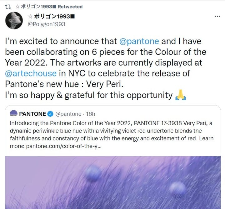 與此同時,彩通計劃與藝術家 Polygon1993 攜手推出 6 件以 Very Peri 為主打元素的 NFT 藝術作品。