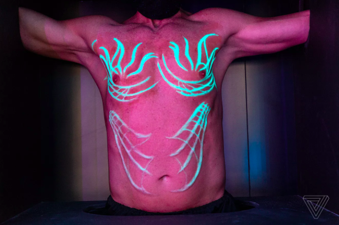紐約 A.Human 展覽現場,模特展示身體植入物,圖片來自:The Verge