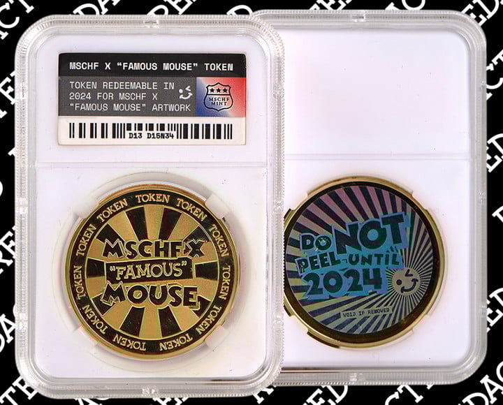 多次得罪耐克、惡搞馬斯克和扎克伯格的紐約創意團隊 MSCHF,精心醖釀了一場為期三年的行為藝術,2021 年發售概念代幣,買家可在 2024 年兑換他們出品的米老鼠手辦。