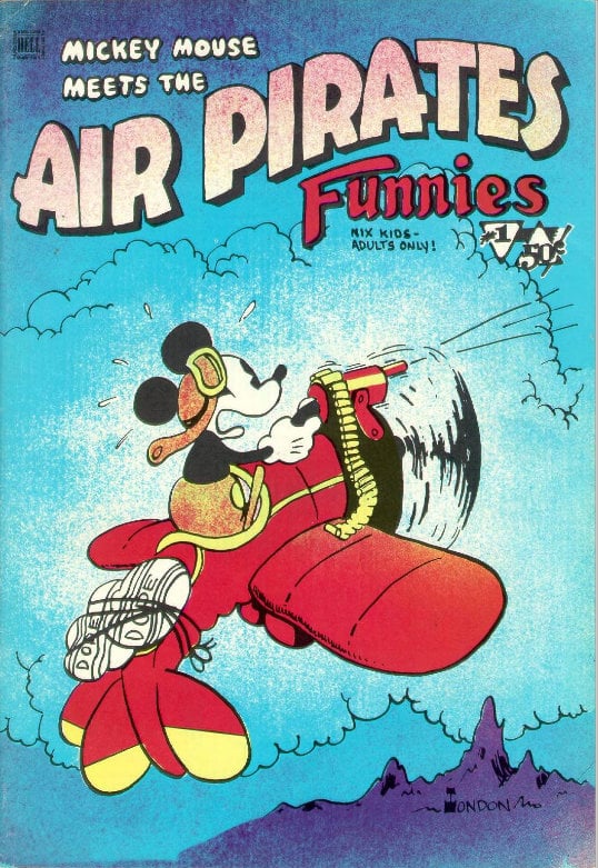 1971 年的諷刺漫畫《空中海盜》裏,米老鼠被憤世嫉俗的地下漫畫家們塑造成了非常「不迪士尼」的樣子,性、毒品、政治私下都沾。
