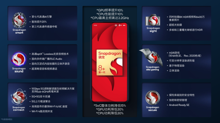 驍龍 8+ 移動平台採用了 4nm 的先進工藝製程,有着更加突出的能效比,三叢集架構的 CPU 每個核心都有了頻率提升,帶來了 10% 的性能提升。