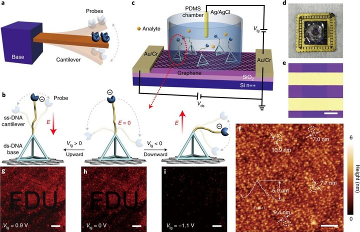 因此,復旦大學的研究團隊研發了一種基於 MolEMS(分子機電系統)的晶體管傳感芯片。他們提出的 MolEMS(分子機電系統),是一種通過 DNA 分子自組裝而成,通過外電場驅動,能精準調控分子識別和信號轉化過程的微型裝置。