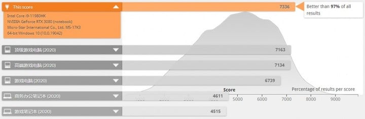 在室温 24 攝氏度條件,性能最強條件下,微星 GE76 的得分是 7336,超過 97% 的測試機型,這個整機性能表現也基本符合預期,對得起頂級遊戲筆記本的定位。