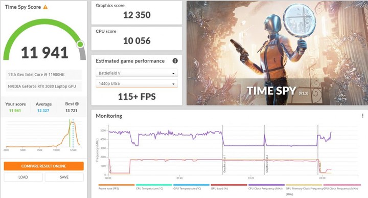 在 Time Spy 測試環節中,微星 GE76 的得分為 11941,嚴格來説,這個分數略低於預期,畢竟同配置下機型的平均得分為 12327。