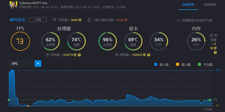 在所有畫質選項均保持最高,光追效果最高,DLSS 自動,分辨率 1080P,顯卡直連條件下,微星 GE76 跑《賽博朋克 2077》的平均幀率為 73fps,整個遊戲過程中的幀率穩定性也還不錯,正式遊戲場景不會出現一下子掉到 60fps 以下的情況。
