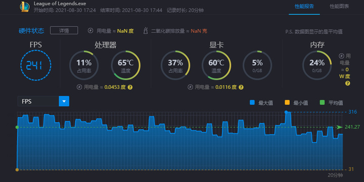 對於微星 GE76 來説,《英雄聯盟》給到的壓力確實很小,關閉幀率鎖定之後,幾乎全程幀率都在 200 以上,平均幀率 241,同時 CPU 的負載也僅有 11%,發熱情況也好很多了。