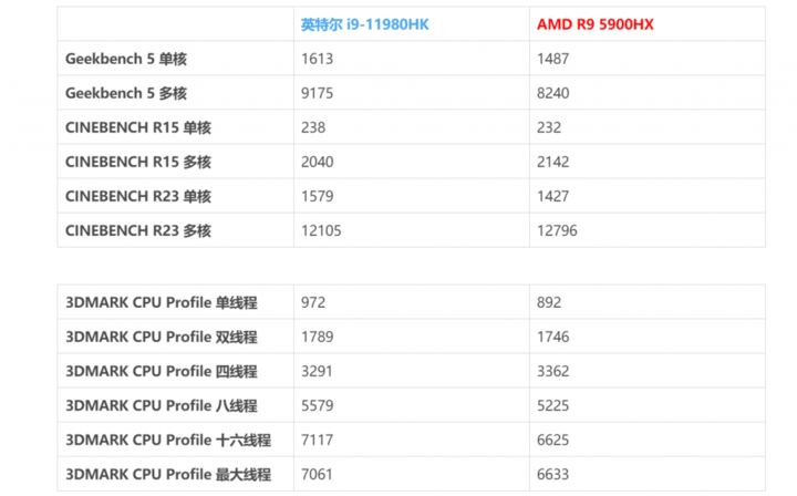 通過上表,估計大家也能對 i9-11980HK 和 R9 5900HX 的性能對比有個概念了。
