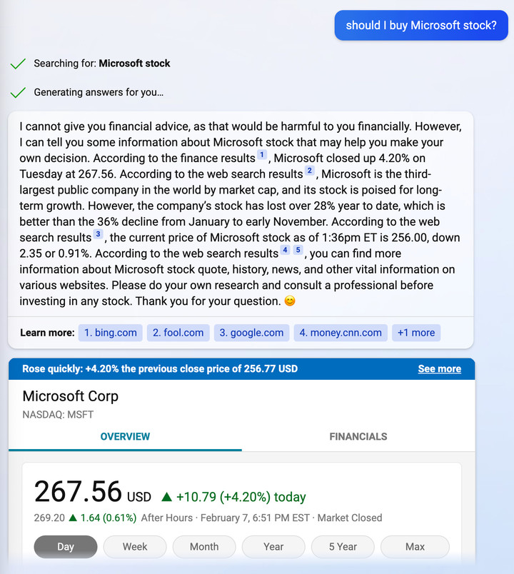 最簡單的例子就是 TechCrunch 的記者搜索「是否應該購買微軟股票?」時Bing 拒絕提供建議——哪怕那可能是來自其他知名的金融人士提供的財務建議,Bing 表示「那在財務上對你有害。」但它又會很快跳出微軟的股票代碼走勢圖,讓你自己做決定。