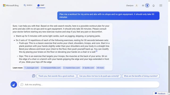 Engadget 的記者在測試時搜索了 30 分鐘的鍛鍊計劃,要求無器械、重點鍛鍊手臂和腹肌,不做仰卧起坐。Bing 按照他的需求生成了一份看上去非常合理的健身計劃,生成答案時還引用了各種各樣的出版物。這意味着Bing 還做了些編譯工作,而不只是反覆引用一篇文章。