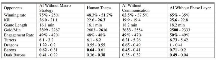 為了印證這個策略的有效程度,「絕悟」AI 分別和沒有宏觀策略的 AI,人類頂尖選手,沒有交流協作機制的 AI,以及沒有階段層策略的 AI 進行了四組對戰,上圖顯示的勝率還是比較能説明「分層宏觀策略模型」是行之有效的。
