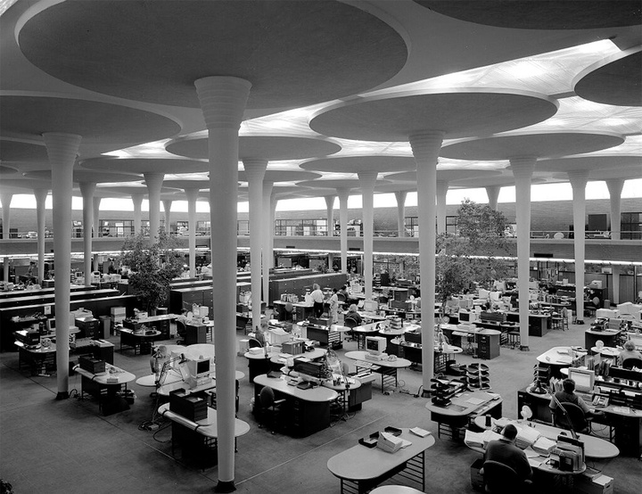 ▲ 開放式辦公室的代表作:1939 年完工的 Johnson Wax 總部. 圖片來自:Out Of Office