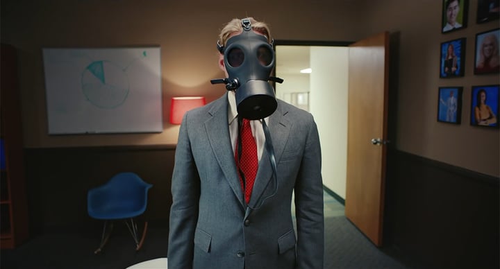 這些被選中的幸運之人帶着氧氣面具到達辦公室,從早上 9 點到下午 5 點敲着打不開的蘋果、戴爾等品牌電腦,度過富有「工作價值」的每一天。剛剛入職的男主角,分配到的工作隔間裏擺的恰好是一台紅色的  iMac G3。