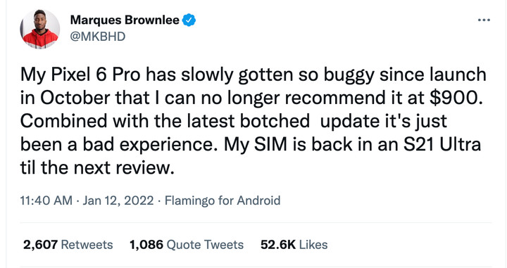 誰到沒想到 Android 系統這個老隊友在關鍵時刻掉了鏈子,不斷出現的 bug 正在一步一步消磨機主們的耐心,知名博主 MKBHD 也在 Twitter 表示因為系統更新問題,他收回對 Pixel 6 Pro 這台機子的推薦。