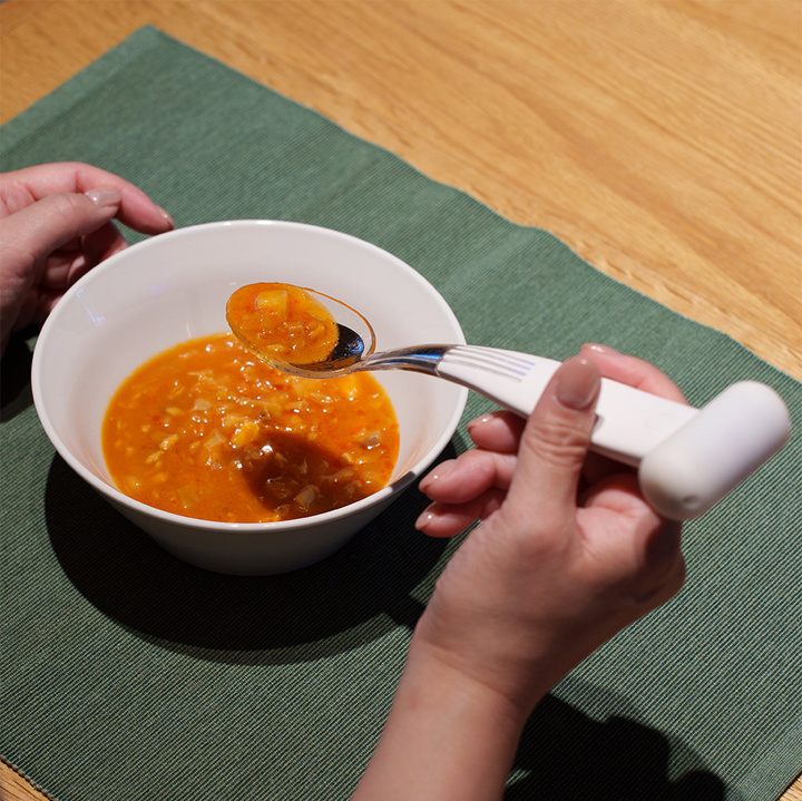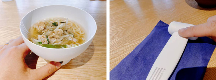 然而,日本一家做不怎麼健康的啤酒和檸檬汽水起家的公司,卻將這套「健康牌」打到了餐具上。用上他們最近剛發佈的這套餐具——高腳碗和勺子,食物少放些鹽和調味品,吃起來也能有滋有味。