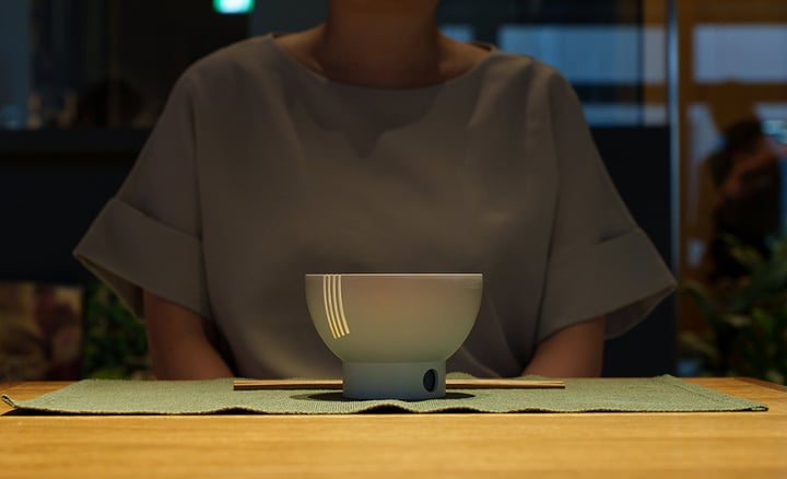 引用這是一個碗狀的計算機。碗的底部有一台計算機,它產生的不是圖像和聲音,而是味道。未來的計算機將以這種方式融入我們的生活,巧妙給予我們支持。