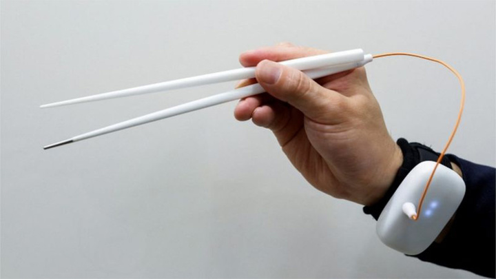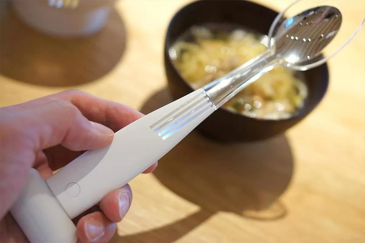 在勺子粗粗的手柄上和碗底裏都藏了釋放電流的設備。當我們用手捧起碗底,以及手抓起勺子的時候,電流會在餐具、舌頭和用餐的手形成一個三角形的閉合循環。