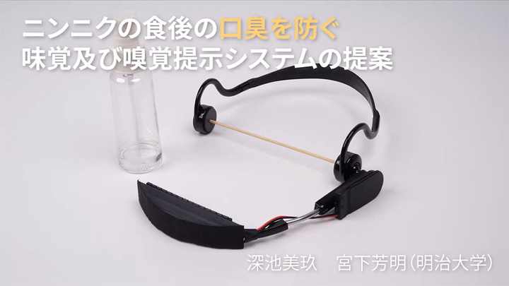 吃大蒜但不想口臭怎麼辦?除了用加入大蒜味道的麪包片,宮下實驗室在 8 月份還推出了一個嗅覺儀器搭配使用——聞着大蒜味道,吃到大蒜味道,但因為事實上沒吃到大蒜,自然也不用擔心口臭問題。