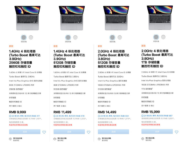 新款 MacBook 13 Pro 國行版本起售價 9999 元,高配版起售價 14499 元。更多價格參考上圖。